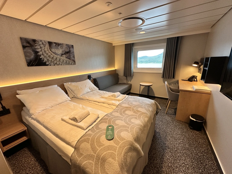 Zurück am Terminal checkten wir ein. Das Einchecken ging schnell und unkompliziert. Schon bei Betreten des Schiffes konnte man die Ruhe und Erholung, welche von dem Schiff ausging, spüren. Die Crew begrüßte uns herzlich. Unser „Zuhause auf See“ war eine Seaview Superior Twin Kabine. Mich überzeugten der geräumige Platz sowie die Einrichtung der Kabine und des gesamten Schiffes. Skandinavisches, hochwertiges Design, indirekte Beleuchtungen und helle Farben sorgen für eine vollkommene Wohlfühlatmosphäre.