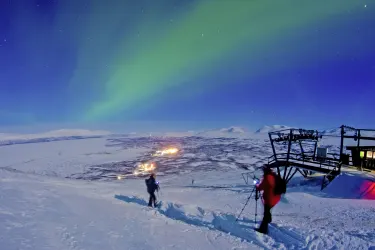 In einem Sessellift gleiten Sie im ruhigem Tempo durch die Dunkelheit, bis Sie auf 900 Metern Höhe die STF Aurora Sky Station erreichen. Dort erwartet Sie eine großzügige Außenterrasse und ein Aussichtsturm, von dem aus Sie das atemberaubende Schauspiel der Nordlichter und den klaren Sternenhimmel bestaunen können. Im Inneren der Station gibt es eine spannende Ausstellung, die die wissenschaftlichen und mythologischen Hintergründe der Aurora Borealis auf anschauliche Weise erklärt. Wenn Sie noch tiefer in das Phänomen eintauchen möchten, können Sie an einer der informativen Nordlicht-Präsentationen teilnehmen, die Ihr Guide mehrmals am Abend hält.