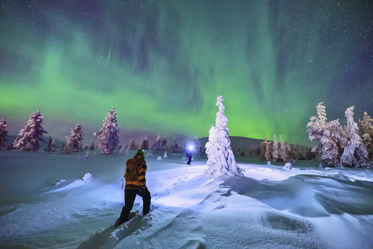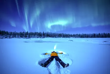 Erkunden Sie die winterliche Wildnis tagsüber bei einer Husky-, Motorschlitten- und Rentiersafari. Abends führt Sie eine Schneeschuhwanderung durch die verschneite Winterlandschaft.