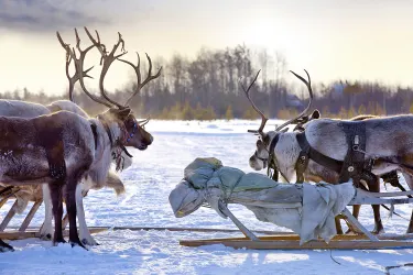 In früheren Zeiten waren von Rentieren gezogene Schlitten im Winter das einzige Transportmittel in Lappland – nicht selten bestand ein solches Gespann, genannt „Raito”, aus 25 - 30 Rentieren. Bei der Safari erleben Sie diese friedvolle Art der Fortbewegung durch die stille Schneelandschaft, in der nur das helle Läuten der Rentierglocken zu hören ist. Im Anschluss erfahren Sie bei einer Tasse Kaffee Wissenswertes über die Tiere.