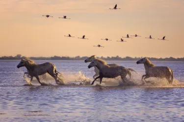 Entdecken Sie die wilde Naturlandschaft der Camargue mit ihren Lagunen, Sümpfen und Salzgärten. Weiße Pferde, schwarze Stiere oder rosa Flamingos können Sie mit etwas Glück sehen. Ein Zwischenstopp im charmanten Saintes-Maries-de-la-Mer lädt zum Flanieren ein.