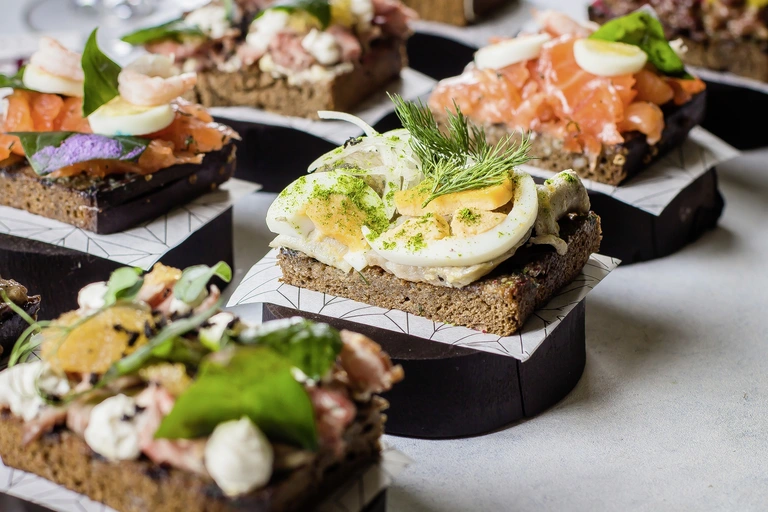 Smørrebrød ist ein traditionelles dänisches Gericht und besteht aus dunklem Roggenbrot, das mit verschiedenen Belägen wie Hering, Räucherlachs, Leberpaste oder frischem Gemüse reserviert wird. Typischerweise werden die belegten Brote kunstvoll angerichtet und als Mittagsessen gegessen. Besucher Dänemarks finden Smørrebrøds in vielen Cafés und Restaurants, besonders in Kopenhagen. Es ist eine gute Möglichkeit, die dänische Esskultur kennenzulernen, da jede Kombination von Belägen unterschiedliche regionale Traditionen und Geschmacksrichtungen widergespiegelt.