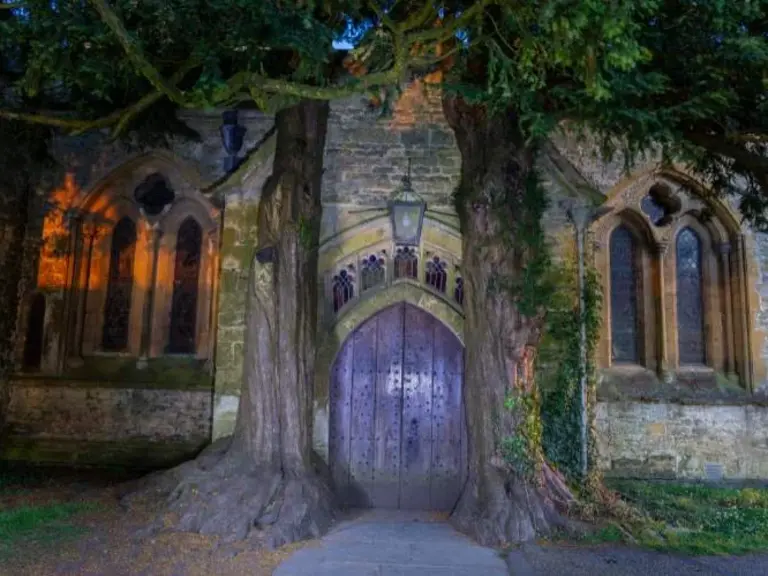 Die kleine Marktstadt Stow-on-the-Wold in den Cotswolds birgt einen unscheinbaren, aber faszinierenden Ort für Fans von J.R.R. Tolkien. An der St. Edward’s Church befindet sich die berühmte „Tolkien-Tür“, eine alte Holztür im nördlichen Vorraum der Kirche, die von zwei mächtigen, jahrhundertealten Eibenbäumen umrahmt wird. Die gewundenen Wurzeln und das dunkle Grün der Eiben lassen die Tür wirken, als würde sie von uralten Wächtern behütet – ein Bild, das unweigerlich an die „Türen von Durin“, das verborgene Eingangstor nach Moria in Der Herr der Ringe, erinnert.